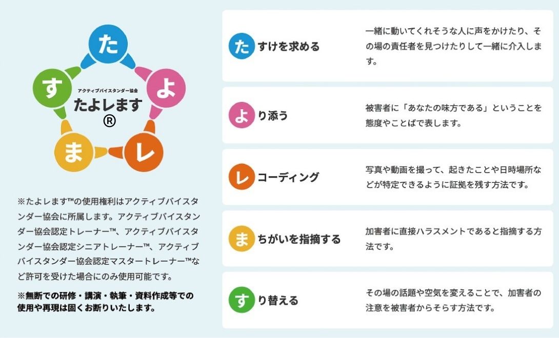 「介入してください」と言われても、誰もがすぐに行動できるわけではありません。とはいえ、行動を踏み出すための具体的な方法を知っておくことで、いざというときの一歩につながります。研修では、そうした方法を丁寧にお伝えし、実際の行動につながる後押しをしています。アクティブバイスタンダー協会では、バイスタンダーの介入方法として「たよレます®」という5つの行動を紹介しています。これは、それぞれの方法の頭文字を取った語呂合わせにすることで、覚えやすく、実践しやすくなるよう工夫したものです。以下にその概要をご紹介します(なお、実際の研修では各手法の使い分けや、状況に応じた安全な実践方法について専門的な解説を行っています。無断での複製・利用・二次使用はご遠慮ください)。「た」たすけを求める